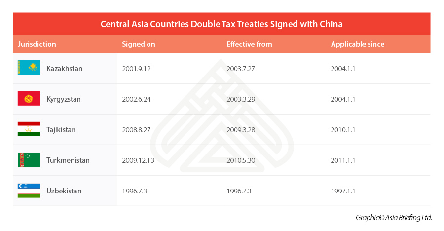 Double tax treaties or double taxation agreements (DTAs) are signed by jurisdictions to avoid or minimize double taxation of the same income of an investor by two countries. Although the DTA mainly applies to direct taxes, such as individual income tax and corporate income tax, it plays a significant role in trade promotion by contributing to the elimination of trade barriers and advancing the trade and investment cooperation between the states. By far, China has signed DTAs with all five Central Asian countries.