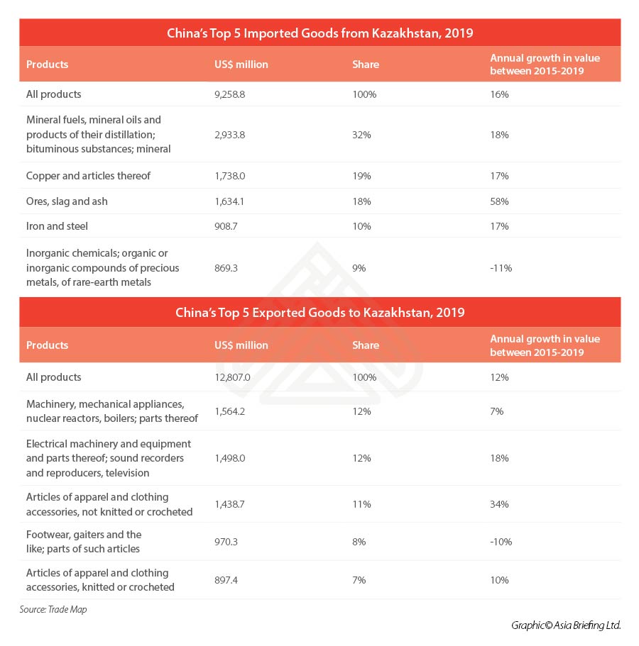 Based on 2019 data, China is Kazakhstan’s second largest trading partner. Kazakhstan’s imports from China were at 17 percent (US$6,537 million) and exports to China at 13.6 percent (US$7,823 million). Trade between China and Kazakhstan has grown steadily over the past five years, expanding at an average annual rate of 16 percent.