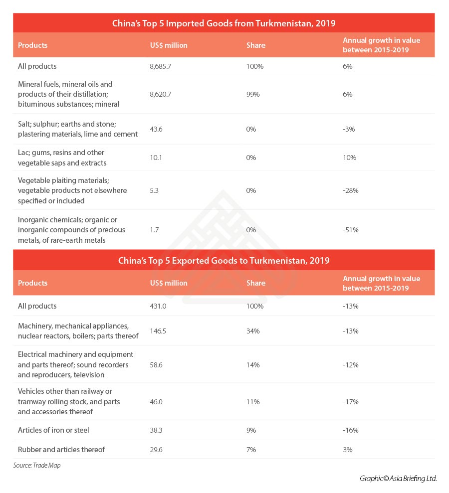 For exports, China is Turkmenistan’s largest trading partner, accounting for 80.2 percent of Turkmenistan’s total exports worth US$8,685 million in 2019. For imports, China is Turkmenistan’s third largest trading partner, accounting for 14.3 percent of its total imports.