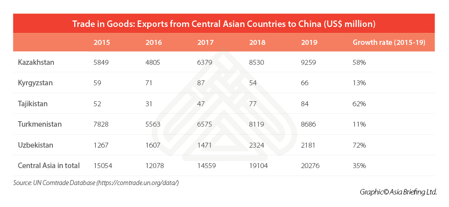 From 2015 to 2019, export of goods from Central Asia countries to China grew by 35 percent from US$15,054 million to US$20,276 million, with Kazakhstan, Tajikistan, and Uzbekistan reporting the fastest growth of over 50 percent.